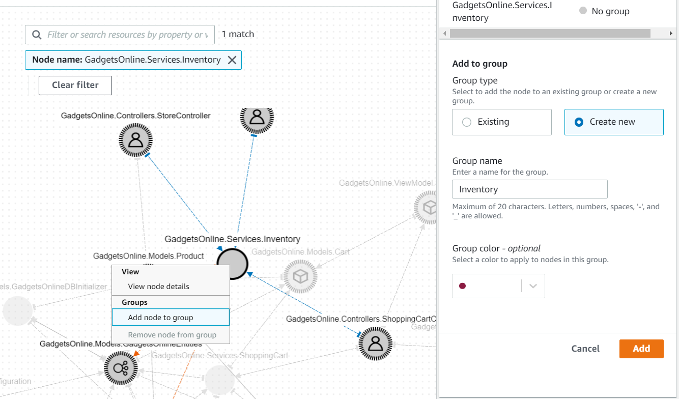 A criação do grupo diz respeito a quais nodes você deseja anexar em um conjunto e realizar posteriormente a operação de extração deste conjunto. Como nosso intuito é a extração apenas do Inventory como um microsserviço separado, o grupo foi criado apenas deste node.