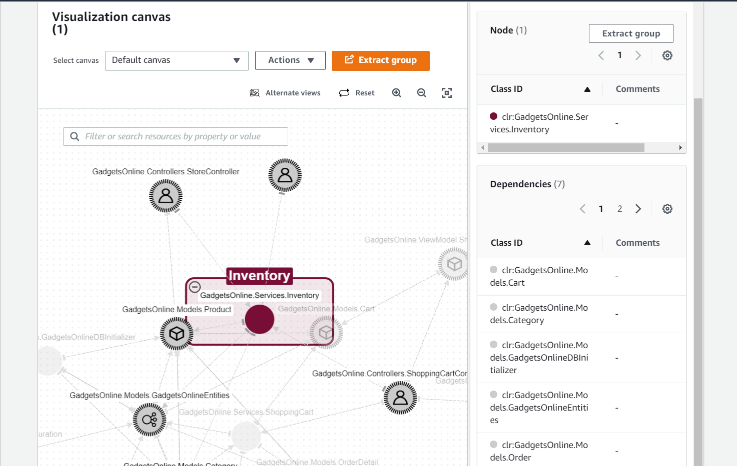 É possível visualizar os detalhes de um grupo ao clicar no mesmo. A lista de nodes mostra a classe Inventory. As classes apresentadas são extraídas como um serviço independente. Já a lista de Dependencies mostra as dependências que serão copiadas ou referenciadas no serviço independente extraído.