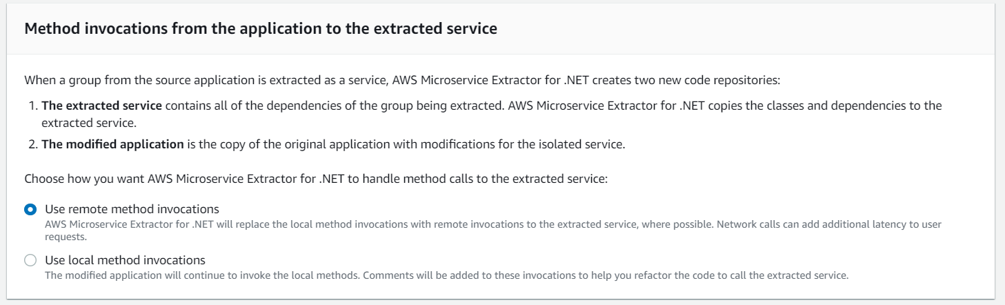 Na seção acima, caso a opção “Usar invocações de método remoto” seja selecionada, o AWS Microservice Extractor substituirá as invocações da classe de inventário local pelas chamadas remotas da API REST como parte do processo de extração. Caso a outra opção seja selecionada, a aplicação extraída continuará tendo a invocação para métodos locais.