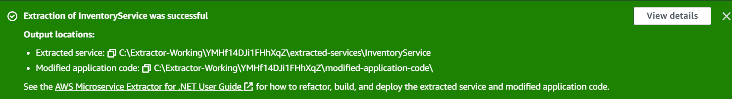 Observe que o AWS Microservice Extractor fará o possível para compilar o serviço recém-criado, mas isso não é uma garantia. Talvez você ainda precise corrigir referências ou atualizar pacotes NuGet para compilar o projeto de API Web.