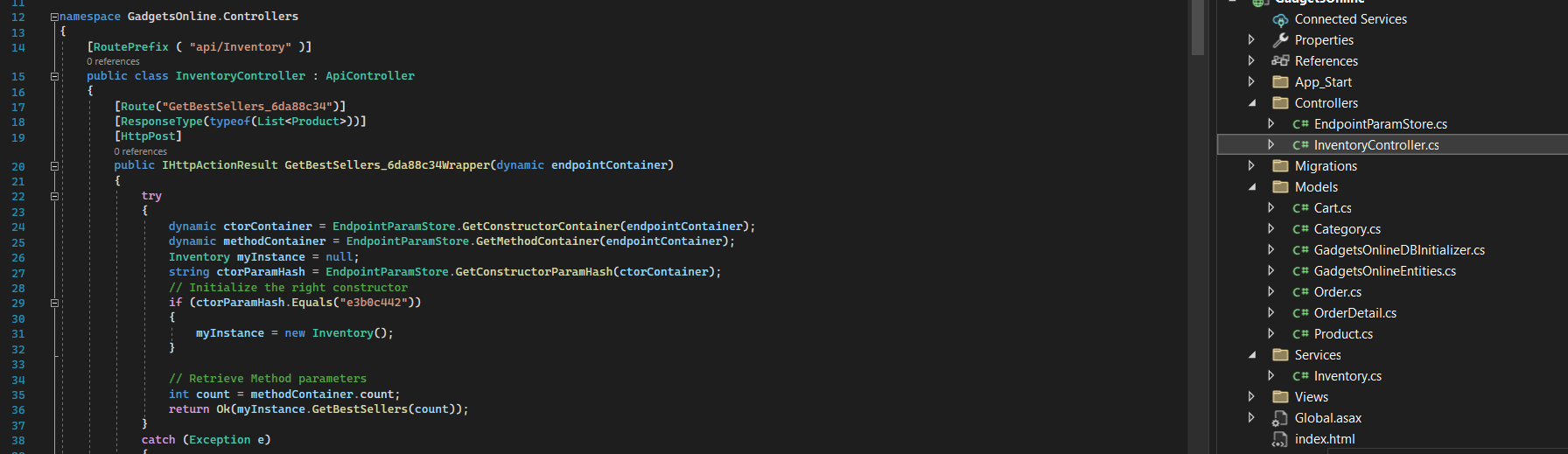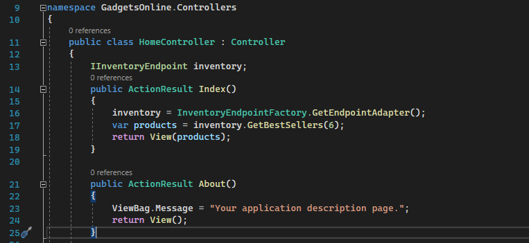 - Modified application code: abra o arquivo de solução na pasta Modified application code para abrir o projeto ASP.NET no Visual Studio e revisar a cópia da aplicação monolítica atualizada. Na pasta Controllers, revise cada controlador. As chamadas de classe de Inventory locais são convertidas em chamadas de API remotas usando o EndpointAdapter.