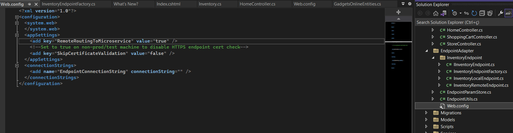 Revise a pasta EndpointAdapter que foi criada como parte do processo de extração. Ele tem uma classe InventoryEndpointFactory que pode alternar entre chamadas de API REST remotas e chamadas de classe de Inventário locais com base em um sinalizador chamado RemoteRoutingToMicroservice em um arquivo web.config local.