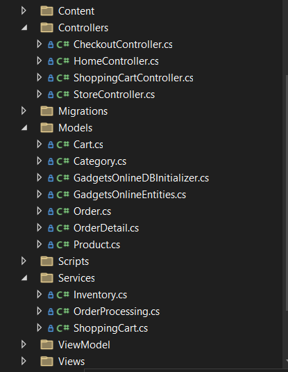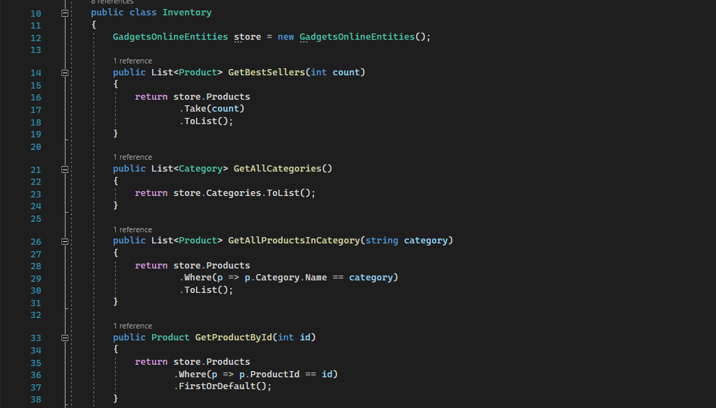 Revendo Services\Inventory.cs, vemos vários métodos usando uma instância de Models\GadgetsOnlineEntities DbContext para buscar modelos de dados e filtrar com base em uma ou mais condições.