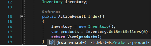 Ao revisar o método Index() no arquivo Controller\HomeController.cs, vemos a criação de uma instância da classe Inventory. Em seguida, estamos chamando o método GetBestSellers() para obter os 6 produtos mais vendidos a serem listados na página inicial. Como você pode ver, esse método retorna uma Lista de objetos do modelo de dados do Produto.