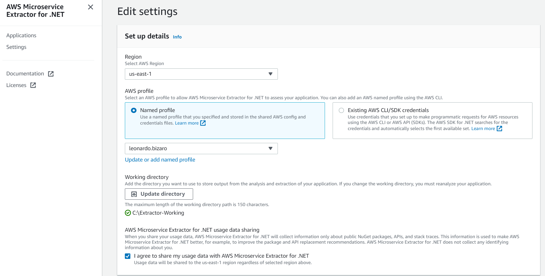 Especificar a região AWS a ser utilizada, juntamente com um usuário IAM da AWS (perfil padrão ou perfil configurado pela AWS CLI com credenciais), e o diretório de trabalho que você deseja armazenar a saída da análise e extração.