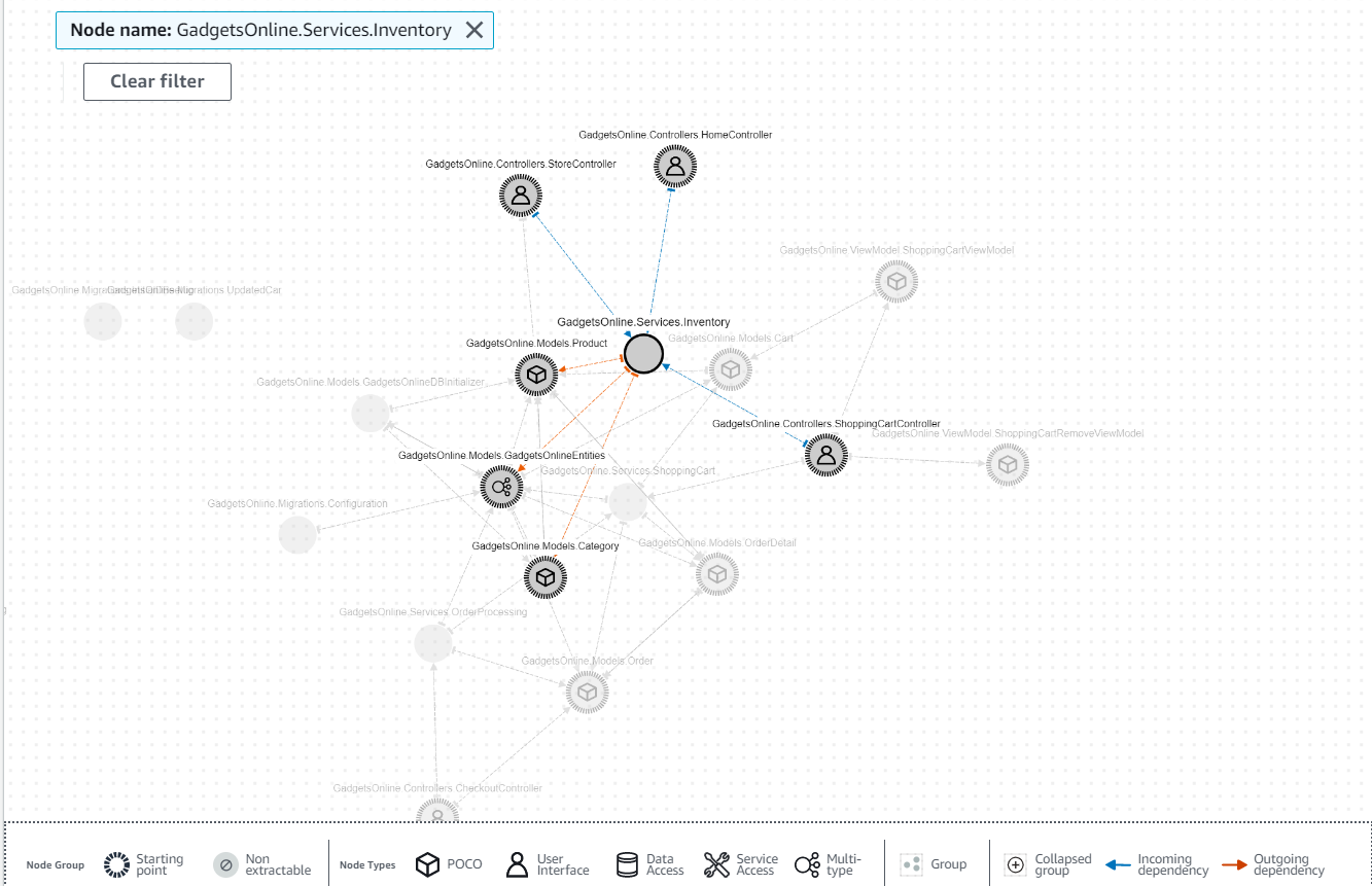 O Extractor usa análise de código-fonte e métricas de tempo de execução para produzir uma visualização que mostra gráficos de dependência, métricas de execução (por exemplo, contagens de chamadas de tempo de execução) e referências estáticas entre artefatos de código (por exemplo, classes). Você pode usar a visualização e as contagens de chamadas para entender as dependências entre os componentes e identificar as os componentes mais chamados. Depois de selecionar as dependências para preparar partes da aplicação para extração, você pode usar o AWS Microservice Extractor for .NET para extrair endpoints de API. O Extractor extrai o código subjacente a esses endpoints de API substituindo chamadas locais por chamadas remotas. Você pode então desenvolver, construir e implantar esses projetos como achar melhor. A AWS recomenda que você teste completamente seu aplicativo depois de transformá-lo com o AWS Microservice Extractor for .NET antes de usá-lo em produção.