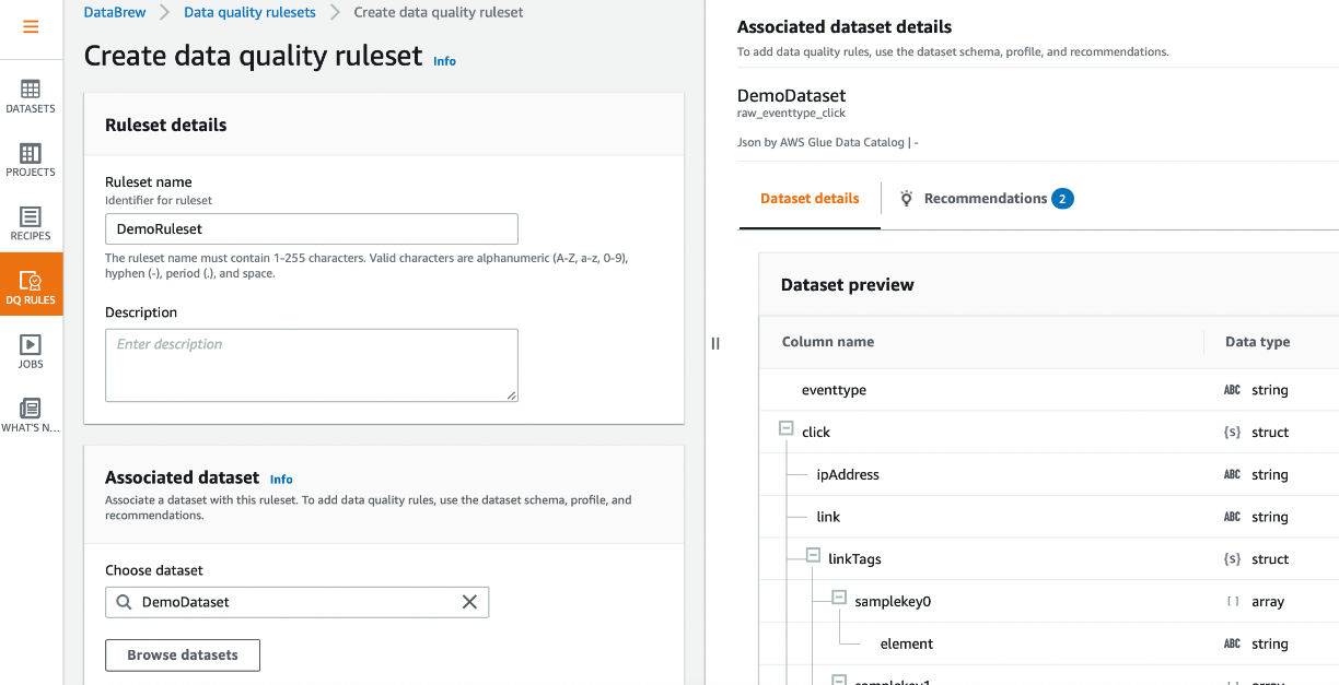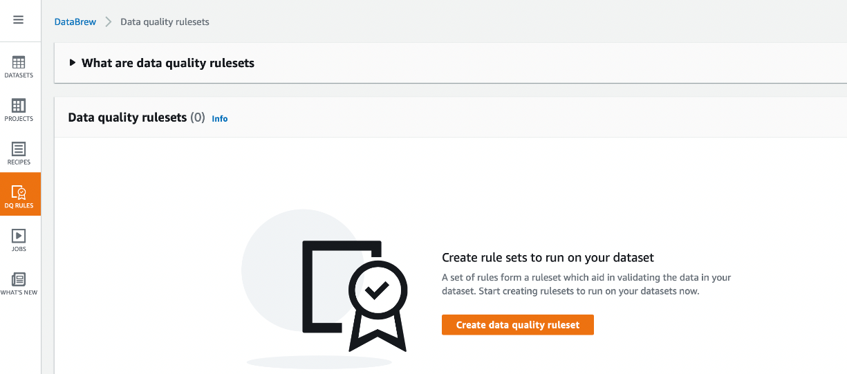 - Depois de criar seu conjunto de dados, acesse DQ RULES no painel de navegação e escolha “Create data quality ruleset” (criar conjunto de regras de qualidade de dados).