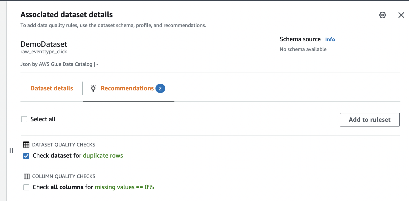 - Consulte a guia de “Recommendations tab” (guia de recomendações), que lista algumas sugestões de regras que você pode usar como seu conjunto de regras. Você pode selecionar todas, algumas ou nenhuma das recomendações. Neste exemplo, usando um conjunto de dados de “Amostra de cliques e eventos de entrega para emails SES”, podemos observar que o Glue DataBrew está sugerindo duas regras para verificar linhas duplicadas e valores ausentes nas colunas.