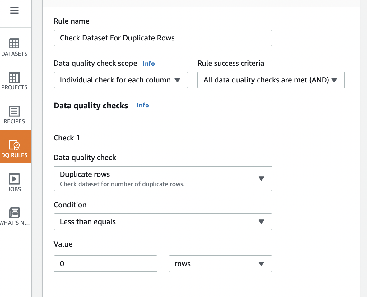 Vamos apresentar agora um exemplo prático de como criar um conjunto de regras de qualidade de dados no AWS Glue Databrew.