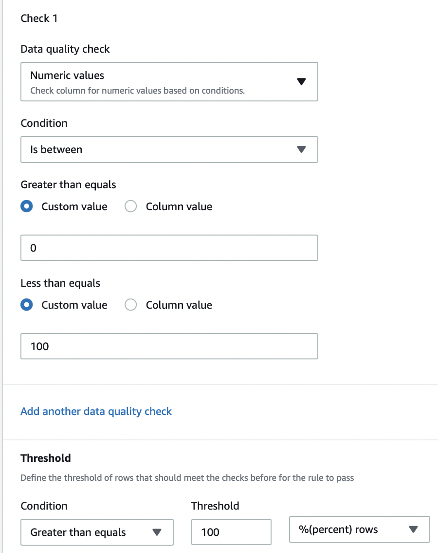 - Escolha adicionar outra regra para adicionar uma regra não coberta pelas recomendações. Você pode alterar os nomes das regras para facilitar a interpretação posterior dos resultados da validação. Podemos incluir uma regra para detectar valores atípicos e anomalias nas colunas do nosso conjunto de dados comparando os valores individualmente com uma porcentagem de suas linhas.