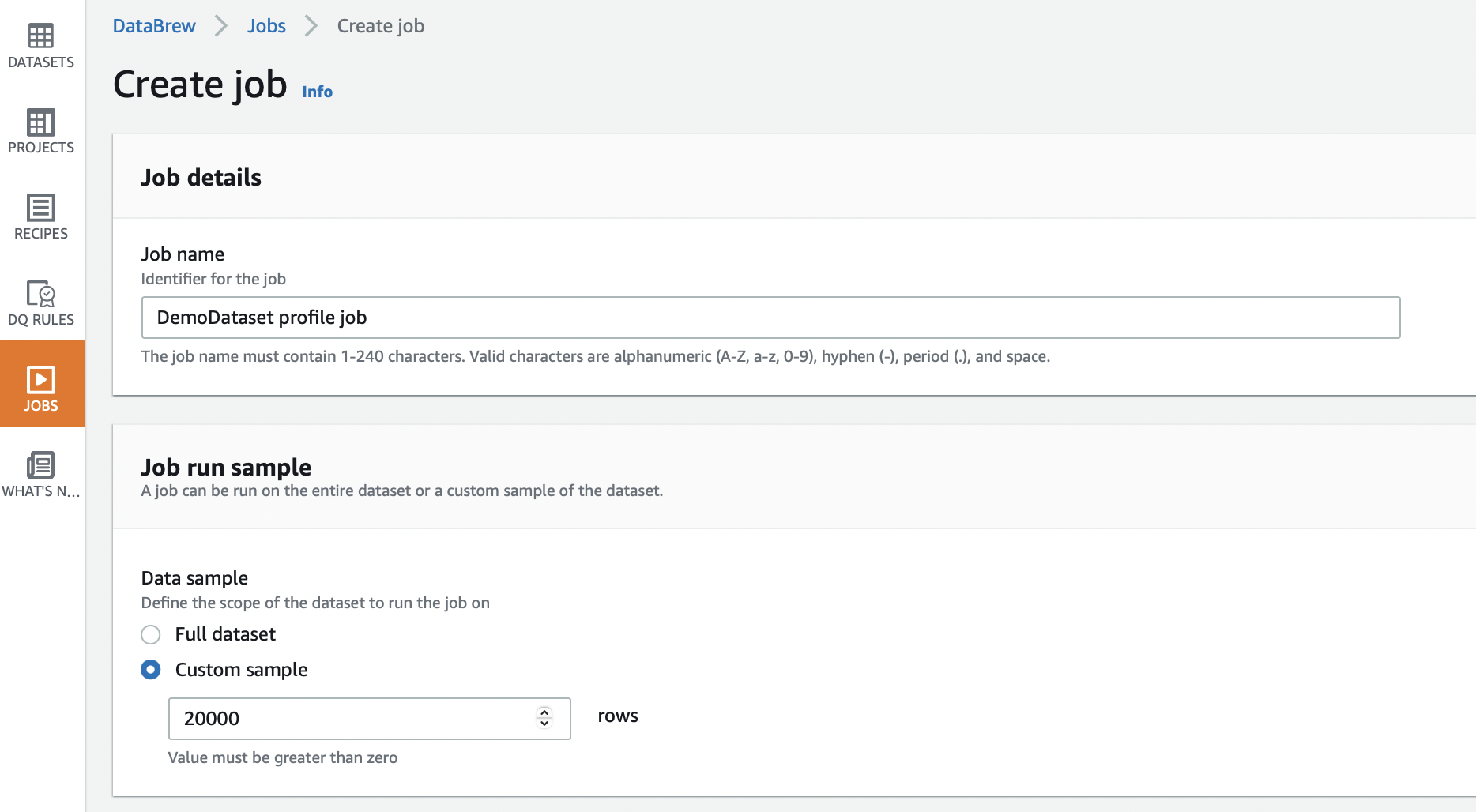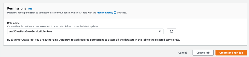 - Por fim, precisamos fornecer uma função do IAM com as permissões para acessar o bucket do S3 e os serviços relacionados do Glue. Se você não tiver a função do IAM, o Glue DataBrew poderá criá-la para você. Por fim, clique em criar e iniciar o trabalho de criação de perfil.