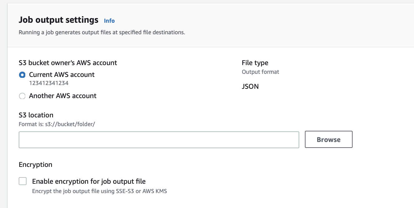 - Podemos definir o bucket do S3 para a saída do trabalho de criação de perfil de dados. Isso pode ser um bucket em sua própria conta da AWS ou em outra conta que tenha as permissões correspondentes do AWS Identity and Access Management (IAM) e as permissões do S3 Bucket. Da mesma forma, podemos habilitar a criptografia da saída do trabalho.