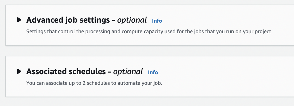 - Em “Advanced job settings“, podemos opcionalmente habilitar tentativas, definir o número de nós, especificar o tempo máximo de execução para o trabalho de criação de perfil de dados. Finalmente, em “Associated schedules” podemos definir a frequência de execução para automatizar a criação de perfil de dados de forma programada, eu diria ou personalizada.