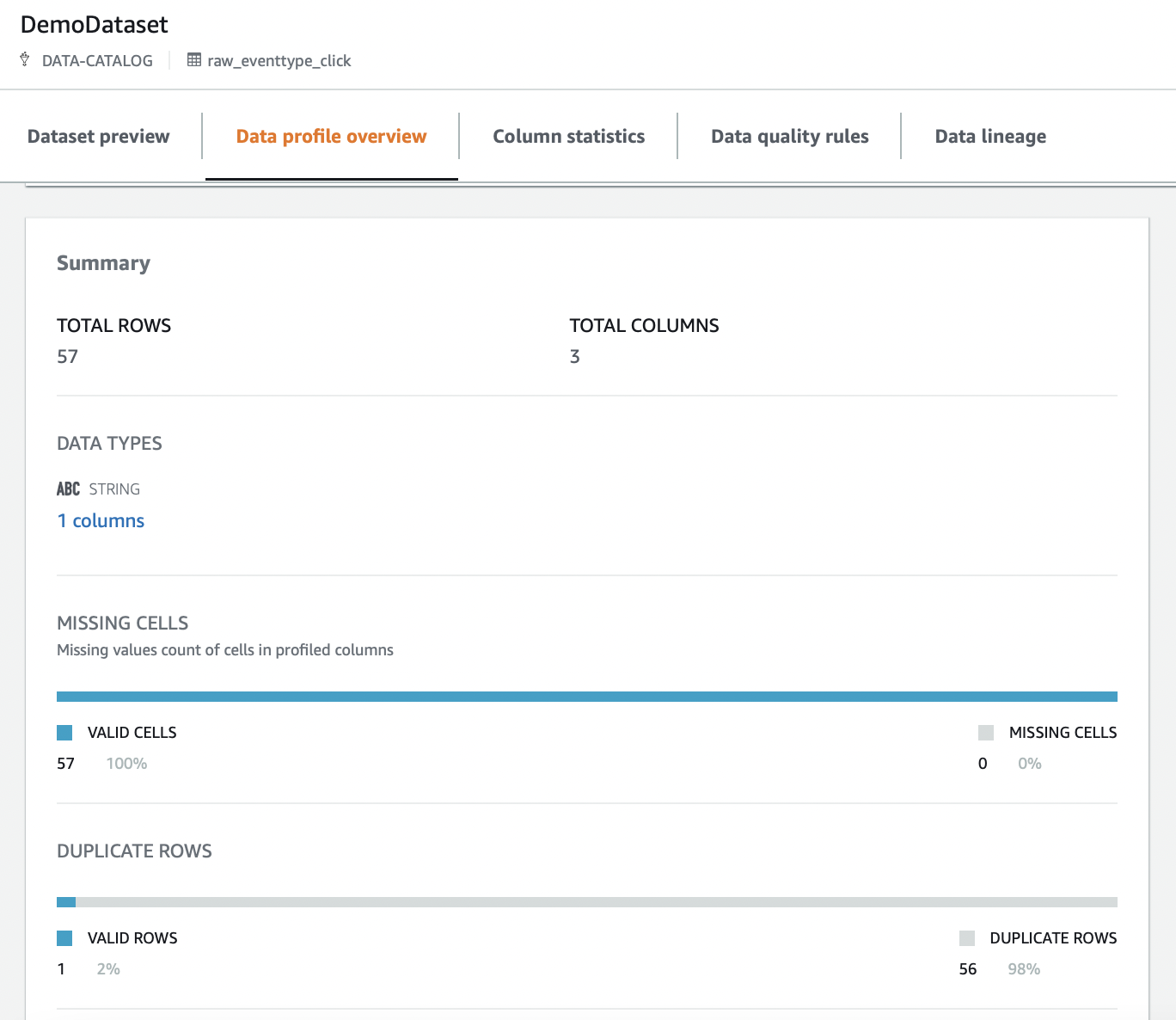 - Após a conclusão do processo de digitalização, podemos visualizar os resultados no Glue DataBrew e em nosso S3 Bucket escolhido para o relatório. Podemos ver que para este exemplo foi constatado que nosso Dataset possui uma alta porcentagem de duplicatas. Portanto, nossa regra de qualidade terá falhado. Finalmente, um processo ETL pode ser realizado com Glue para limpar e corrigir nossos dados.