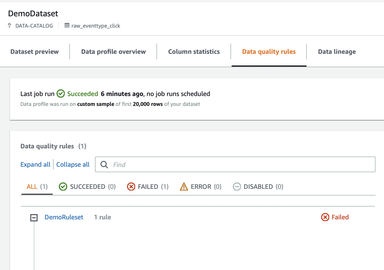 - Agora podemos criar a regra de qualidade de dados. Uma vez criados, seremos redirecionados para um resumo das regras. Escolhemos “Create profile job with ruleset ” para começar a moldar o Conjunto de Dados com as novas regras de qualidade de dados. Podemos executar a criação de perfis de dados em relação a todo o conjunto de dados ou em relação a uma parte das linhas dele.