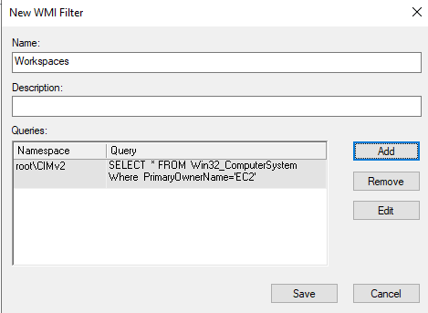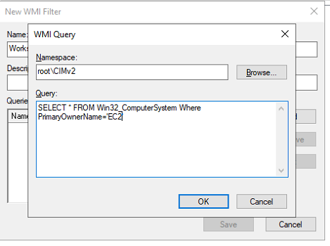 Em outras palavras, os clientes AWS que desejam manter esta configuração e ao mesmo tempo executar o Amazon Workspaces no ambiente, podem optar pelo WMI Filter. O Windows Management Instrumentation (WMI) é a implementação Microsoft do Web-Based Enterprise Management (WBEM), que é uma iniciativa da indústria para desenvolver uma tecnologia padrão para acessar informações de gerenciamento em um ambiente corporativo. O WMI usa o padrão da indústria Common Information Model (CIM) para representar sistemas, aplicativos, redes, dispositivos e outros componentes gerenciados. O CIM é desenvolvido e mantido pela Distributed Management Task Force (DMTF).