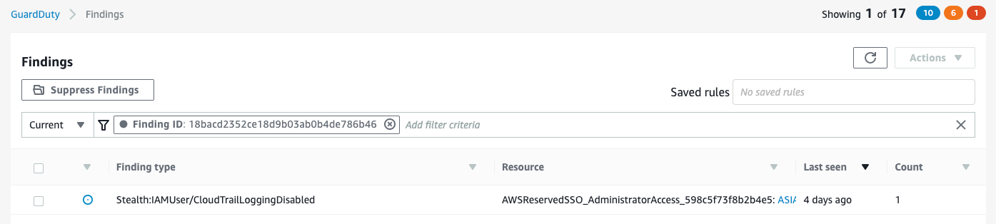 Vamos dar uma olhada em uma descoberta do CloudTrailloggingDisabled no GuardDuty enquanto começamos a tentar responder a essas perguntas. Quando você acessa o console do GuardDuty, uma lista de suas descobertas recentes é exibida. Na Figura 1, um filtro foi aplicado para exibir a descoberta do CloudTrailLoggingDisabled.