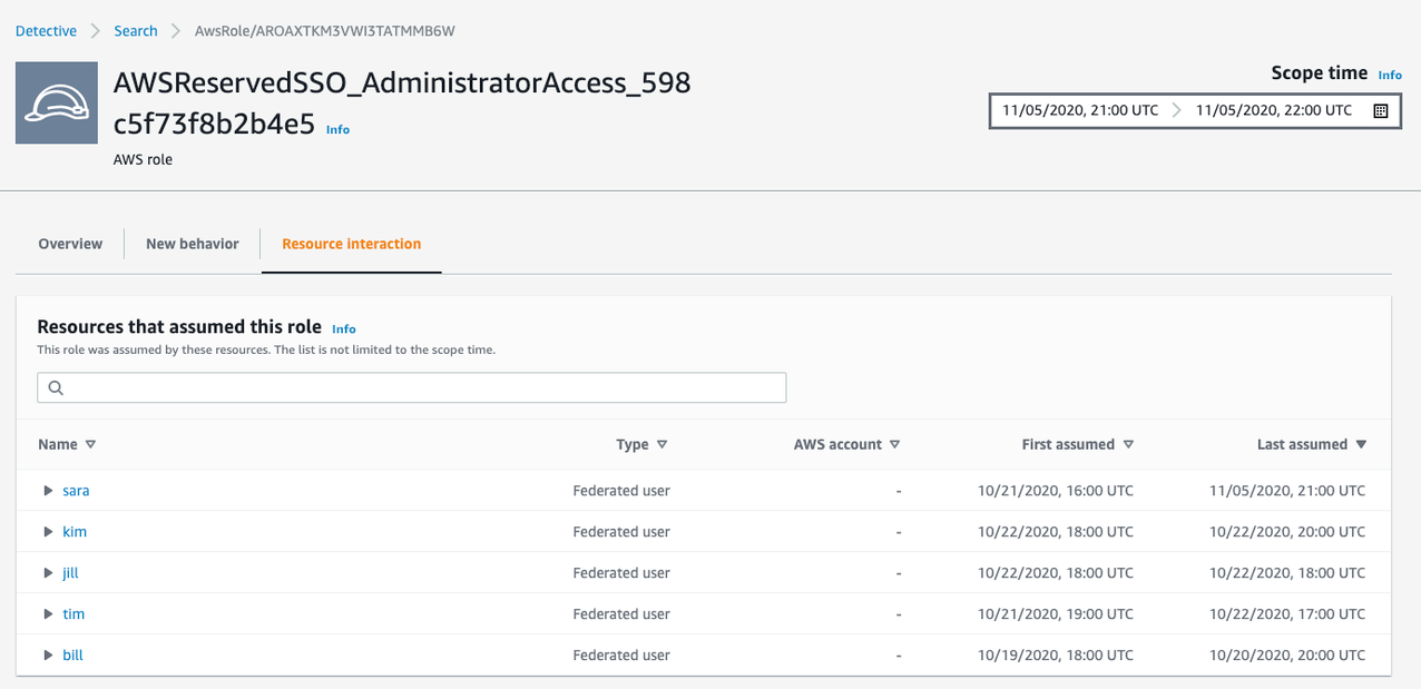 O Detective exibe a página de perfil AWS Role para essa role, e é possível observar a atividade que ocorreu em todos os recursos que assumiram essa role. Para destacar informações relevantes para o período de sua investigação, o Detective mantém sua janela de tempo à medida que você passa da página de perfil de localização do CloudTrailLoggingDisabled para a página de perfil da role.