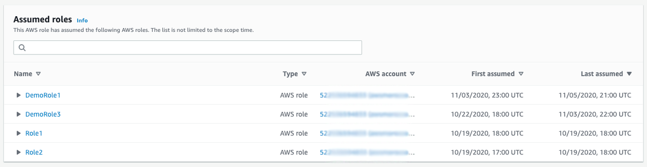 - Na mesma guia deInteração com Recursos (Resource Interaction), ao rolar para baixo, você verá o painel Roles assumidas (Assumed Roles), Figura 12, que ajuda a entender o encadeamento de roles listando as outras roles que foram assumidas pela role AWSReservedSSO_AdministratorAccess_598c5f73f8b2b4e5. Nesse caso, a role assumiu várias outras roles, incluindo a DemoRole1 durante a mesma janela de tempo em que a descoberta do evento CloudTrailLoggingDisabled ocorreu.