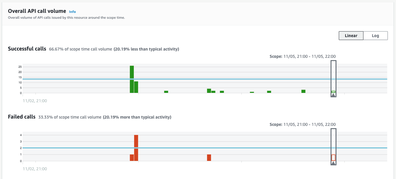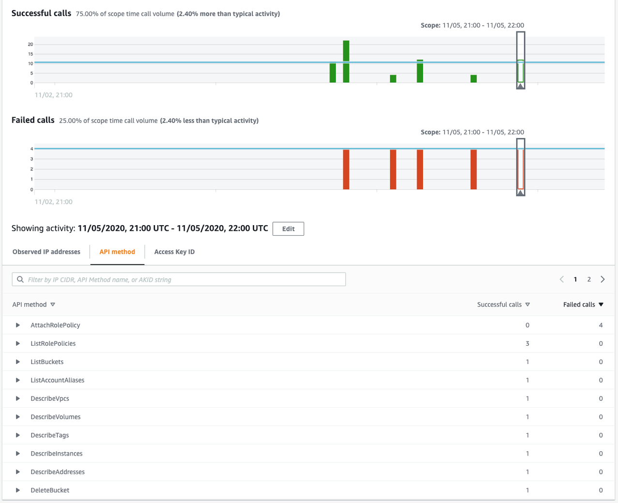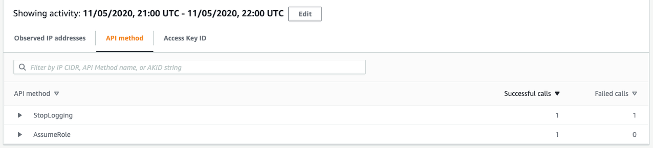 O painel Volume geral de chamadas da API (Overall API call volume) irá expandir para mostrar todos os endereços IP, chamadas de API e chaves de acesso usados por Sara durante a janela de tempo desta descoberta.