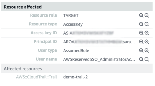 O campo Recursos afetados (Affected resources) indica que a trilha demo-trail-2 é onde os logs foram desativados. Você também pode ver que Tipo de usuário (User type) está definido como AssumedRole e que Nome de usuário (User name) contém a role AWSReservedSSO_AdministratorAccess_598c5f73f8b2b4e5. Essa foi a role que foi assumida para desabilitar o log do CloudTrail. Essas informações podem ajudá-lo a entender os recursos aos quais essa role delega acesso e as permissões que ela fornece. Você ainda precisa identificar quem assumiu especificamente a role para desativar o log do CloudTrail e as atividades que eles realizaram posteriormente. Você pode usar o Amazon Detective para responder a essas perguntas.