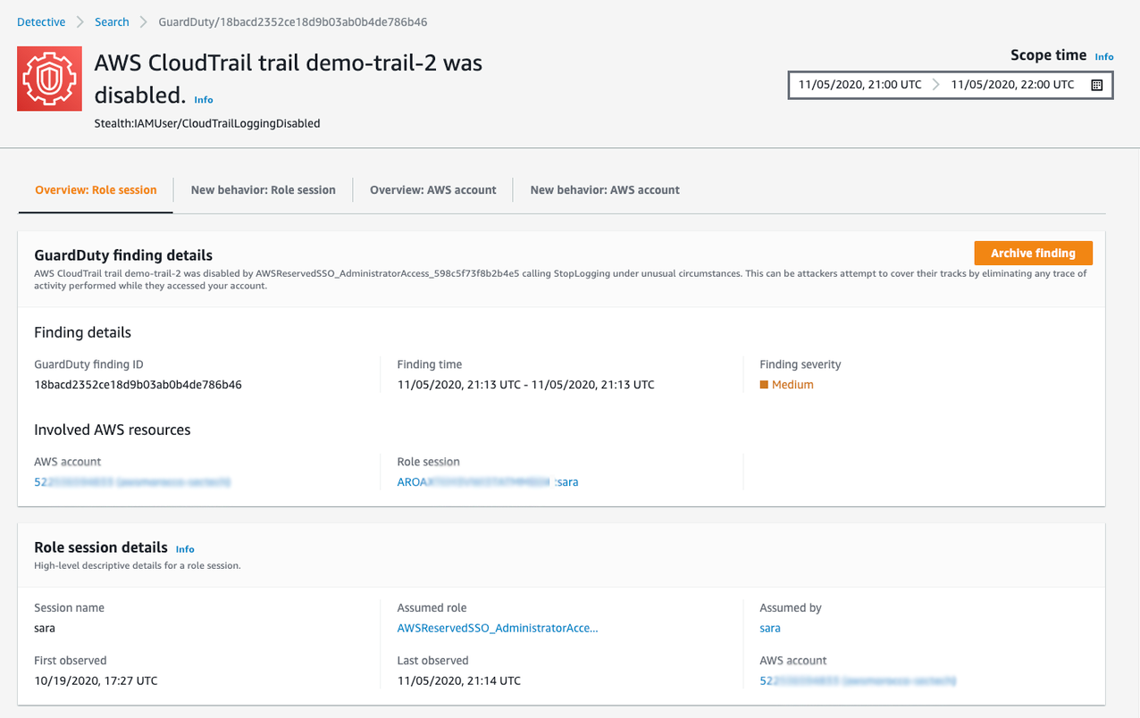 Agora que determinamos que o padrão de acesso e as atividades de Sara são consistentes com seu comportamento anterior, vamos usar o Detective para analisar mais profundamente as atividades de Sara e determinar se ela desativou acidentalmente o log do CloudTrail ou se havia uma possível intenção maliciosa por trás de sua ação.