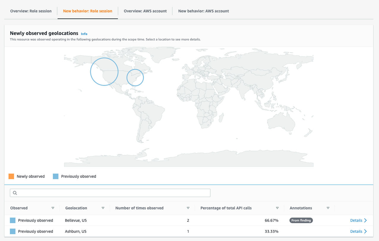 Na Figura 5, é possível observar que Sara tem um histórico de assumir a role AWSReservedSSO_AdministratorAccess_598c5f73f8b2b4e5 de Bellevue, WA e Ashburn, VA, uma vez que essas localizações são mostradas em azul. Se ela tivesse assumido essa role a partir de um novo local, seria possível observar a nova posição indicada em laranja no mapa. Como as chamadas de API feitas por esse usuário são de um local observado anteriormente, é muito improvável que as credenciais do usuário tenham sido comprometidas. Fazer essa determinação por meio de uma análise manual dos logs do CloudTrail seria muito mais demorado.
