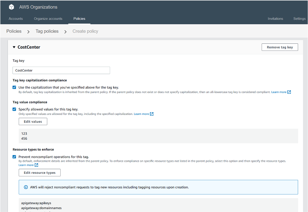 Imagem 1, autoria própria: Configuração da política de tag, permitindo apenas a tag “123” e “456”, sendo elas obrigatórias