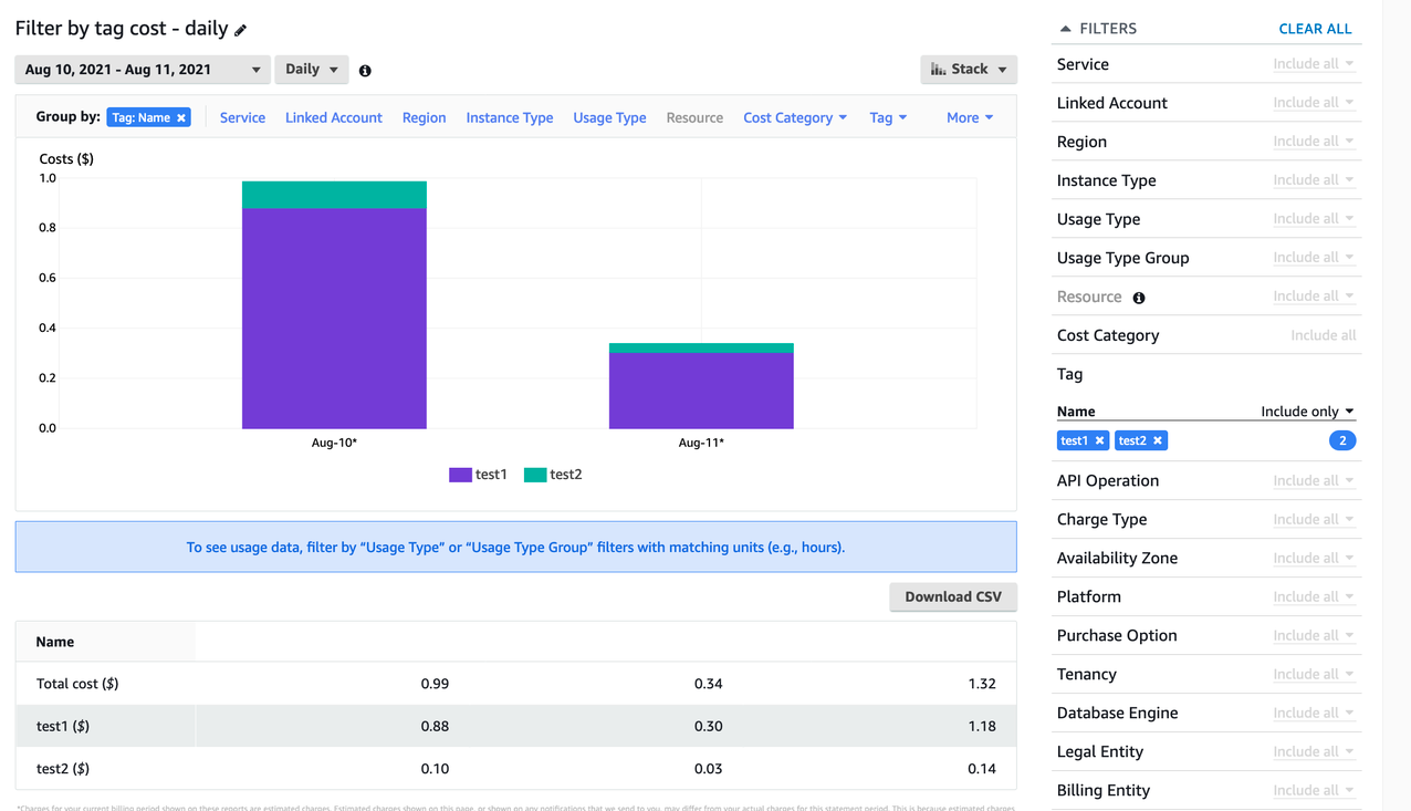 Imagem 3, autoria própria: Gráfico de gastos dentro do AWS Cost Explorer, dividindo os gastos pelas tags “test1” e “test2”
