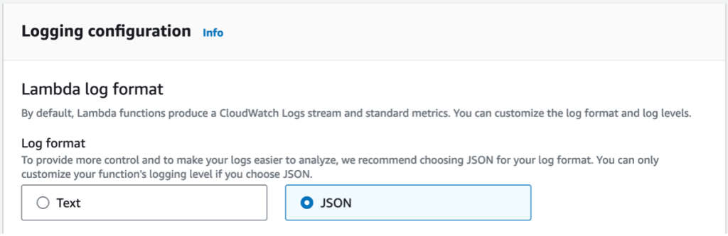 O Lambda agora oferece suporte nativo à captura de logs estruturados no formato JSON como uma série de pares de valores-chave, facilitando a pesquisa e a filtragem de logs com mais facilidade.