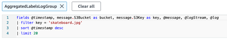 A função do Lambda DetectLabels emite eventos de log DEBUG no formato JSON para o fluxo de log. Eventos de log com o mesmo nível de log da função ExtractText Lambda são omitidos. Isso é resultado das diferentes configurações de nível de log da aplicação para cada função (DEBUG e INFO).