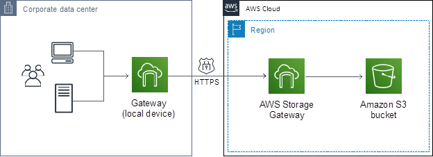 Os aplicativos se conectam ao serviço Storage Gateway por meio de uma máquina virtual no local ou dispositivo de hardware que usa protocolos padrão, como NFS, SMB e iSCSI. Esse dispositivo local se conecta ao serviço Storage Gateway que, por sua vez, se conecta a serviços de armazenamento da AWS, como Amazon S3, Amazon S3 Glacier, Amazon S3 Glacier Deep Archive e Amazon EBS, fornecendo armazenamento para seus aplicativos e usuários que estão no local. Esse dispositivo também é usado como cache local para fornecer acesso de baixa latência aos dados mais ativos. Como a segurança é nossa prioridade na AWS, a conexão com o serviço AWS Storage Gateway é feita por meio de um canal seguro usando HTTPS.
