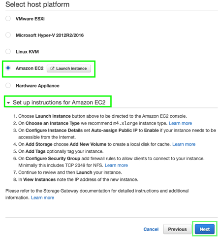 - Em Select host platform selecione Amazon EC2 e siga as instruções em Configurar instruções para que o Amazon EC2 inicie a instância do Amazon EC2 que você usará como Storage Gateway. Ao criar essa instância, considere o seguinte: