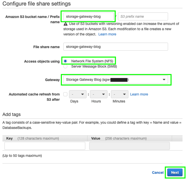 Depois de criar seu Gateway de arquivos, você precisará criar um Compartilhamento de arquivos que você possa montar em instâncias do Amazon EC2.