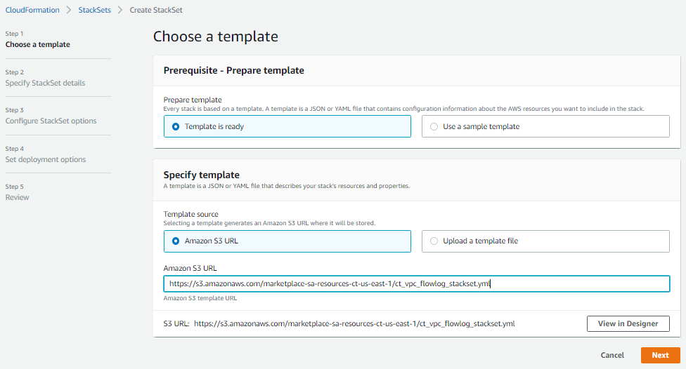 - No console do AWS CloudFormation StackSets, insira a URL do Amazon S3: https://s3.amazonaws.com/marketplace-sa-resources-ct-us-east-1/ct_vpc_flowlog_stackset.yml