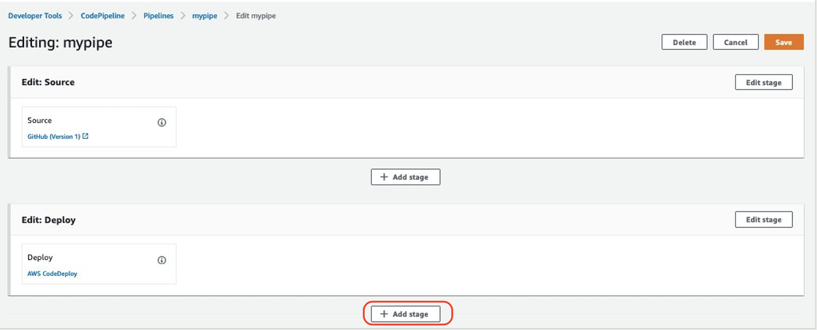 Em Adicionar etapa de implantação, selecione AWS CodeDeploy em Provedor de implantação.