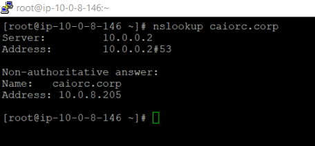8. O servidor linux da VPC “192.168.0.0/16” deve resolver o DNS “caiorc.corp” para o endereço IP “10.0.8.205”. Como podem ver, estes IPs estão em CIDRs diferentes – ou seja, temos conectividade de rede entre estas VPCs para que isto funcione.