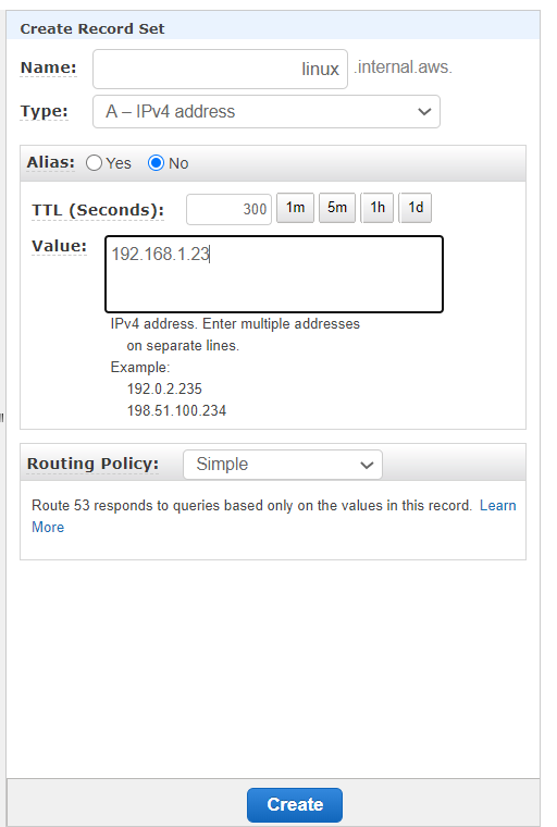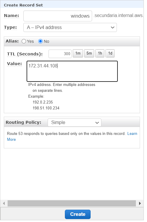 3. Criamos um record “A” com o IP de algum servidor desta VPC, para caráter de teste.
