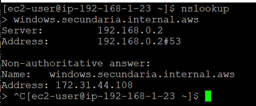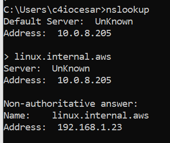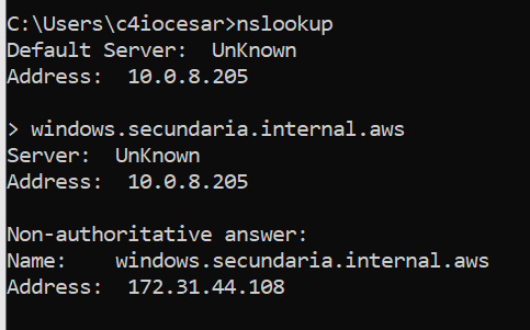 1. Em um computador do ambiente on-premises, efetuamos um nslookup para o endereço interno de uma instância EC2.