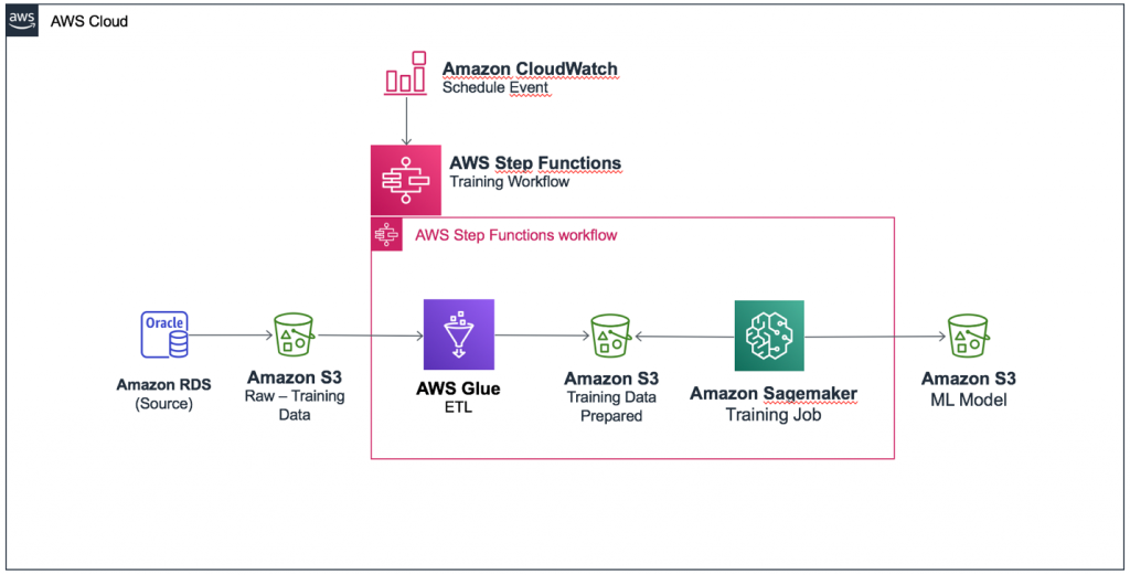 Para orquestração do processo de treinamento é utilizado o AWS Step Functions, responsável por automatizar os próximos passos da solução. É utilizado um evento do Amazon CloudWatch para que o workflow inicie. Para mais informações, acesse detalhes sobre event rules. A partir do início do workflow o AWS Glue é acionado para fazer a preparação dos dados de origem e salva-os no bucket com os dados preparados para o Amazon Sagemaker iniciar o job de treinamento.