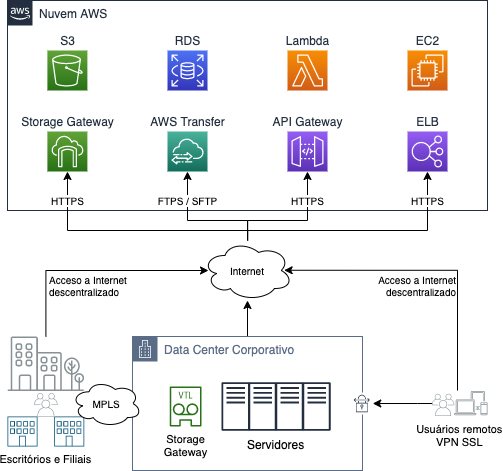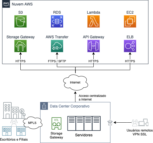 Sem grandes alterações ou investimentos em infraestrutura, você pode conectar servidores locais à nuvem por meio de endpoints públicos da AWS na Internet. Exemplos disso podem ser fazer backup com o Storage Gateway, compartilhar arquivos de interface com o AWS Transfer ou acessar APIs de aplicativos hospedados pela AWS por meio do API Gateway.