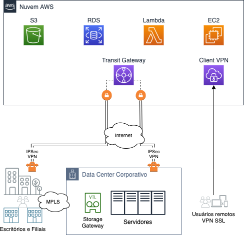 Você também pode configurar VPNs para acesso remoto para usuários corporativos diretamente na Nuvem AWS, usando o serviço AWS Client VPN ou soluções de terceiros.