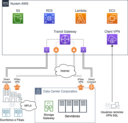 Uma maneira rápida e econômica de estabelecer essa conexão é através de redes privadas virtuais (VPNs). As VPNs são estabelecidas entre um Gateway VPN do lado da AWS ou Transit Gateway e quaisquer dispositivos compatíveis do lado da empresa (“Customer Gateway”). Os dados em trânsito são protegidos pelo padrão de criptografia IPsec.