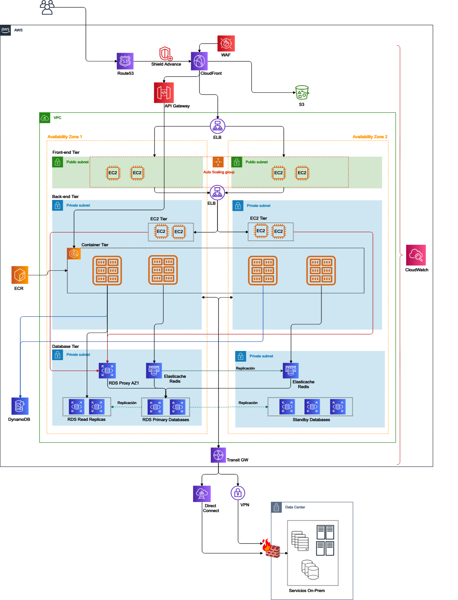 Para o exercício vamos assumir uma arquitetura genérica e simplificada que poderia representar a maioria do e-commerce no mercado. Vamos considerar uma arquitetura de três camadas com uma conexão com um ambiente local (através de uma VPN Site a Site) que permite que o comércio eletrônico se comunique com sistemas legados. Também consideramos que as réplicas dos serviços e servidores já existem em todas as camadas para oferecer alta disponibilidade, mas não necessariamente implantadas em diferentes zonas de disponibilidade. Para nossa revisão, consideraremos boas práticas baseadas no Well Architected Framework, que nos ajudará a criar uma arquitetura segura, de alto desempenho, resiliente e eficiente: