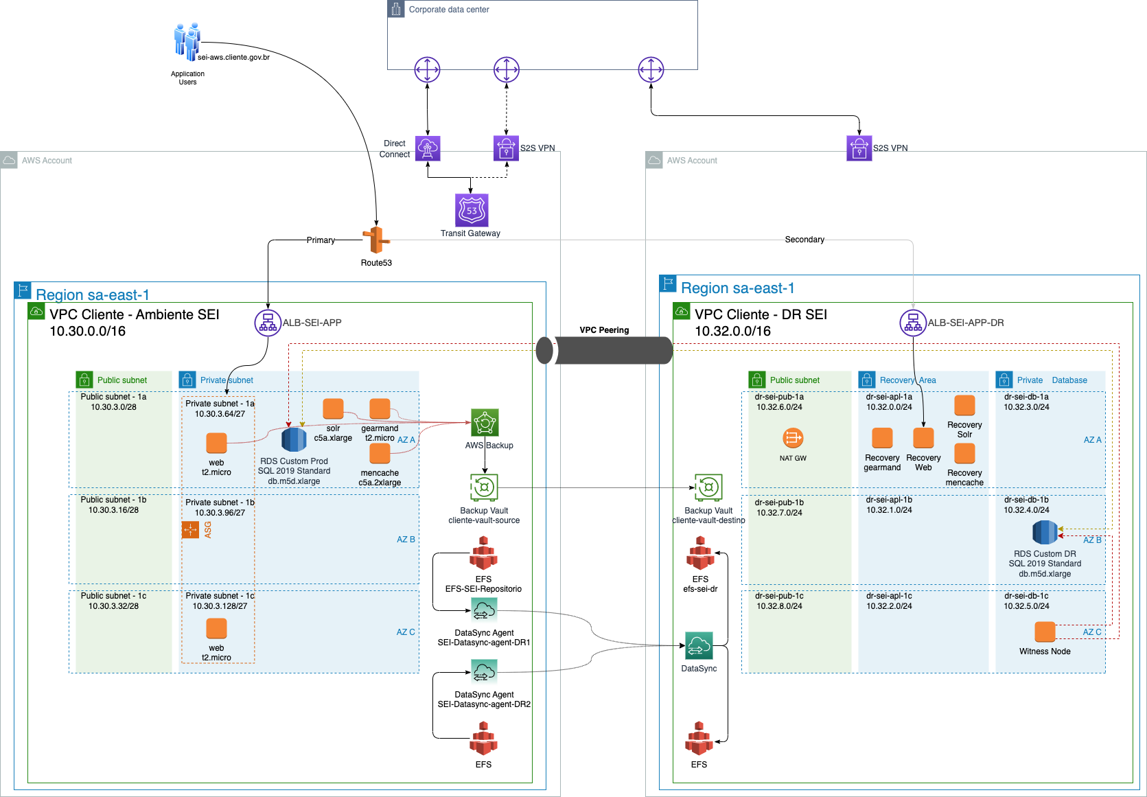 Como apresentado anteriormente, um dos objetivos do cliente na migração para a AWS era garantir alta disponibilidade e um ambiente de recuperação de desastres, independentemente do cenário. Por meio dos serviços já descritos e suas características de alta disponibilidade e resiliência, o time da Embratel propôs a implantação de uma segunda conta (SEI-DR no diagrama), completamente apartada da conta de produção. Para a replicação em tempo real, foram utilizados os seguintes serviços e características: