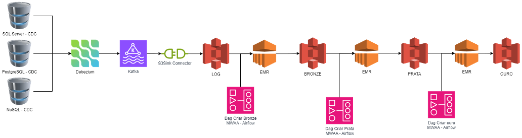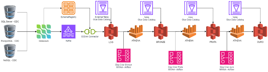 - A camada de aquisição dos dados possui como fonte os diversos bancos de dados que a companhia possui, sendo os principais o SQL Server, o PostgreSQL e o MongoDB. Todos eles possuem o CDC (Change Data Capture) ativo, o que habilita utilizar o conector Debezium para disponibilizar os logs de alteração para o Kafka.