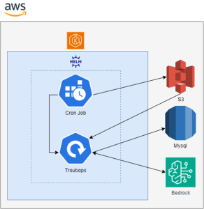 Com um foco incansável na simplificação e na eficiência, o TroubOps é alimentado por uma análise avançada dos serviços fundamentais da AWS incluindo métricas de funções AWS Lambda, Amazon API Gateway, Amazon EKS, Amazon Relational Database Service, Amazon ElastiCache, Amazon CloudWatch, Amazon VPC, AWS CloudTrail e outros serviços que estão por vir. Ao integrar esses dados em uma única plataforma, o TroubOps oferece insights claros, orgânicos e recomendações acionáveis, mesmo para usuários não técnicos, graças à sua integração com modelos de inteligência artificial generativa (LLMs) no Amazon Bedrock. As métricas resgatadas a respeito de uma carga de trabalho são enviadas junto com o prompt para o modelo, e os insights são retornados em linguagem natural.