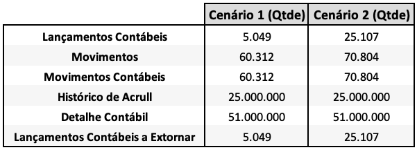 O processamento em cada um dos cenários gerou diferentes volumes de dados conforme descrito na tabela abaixo.