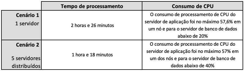 A execução em cada cenário levou tempos diferentes ambos considerados performáticos tanto em relação ao tempo de processamento quanto consumo de recursos para o volume de contratos processados, com destaque para o segundo cenário com arquitetura distribuída no qual o tempo de processamento caiu para metade do tempo do primeiro cenário.