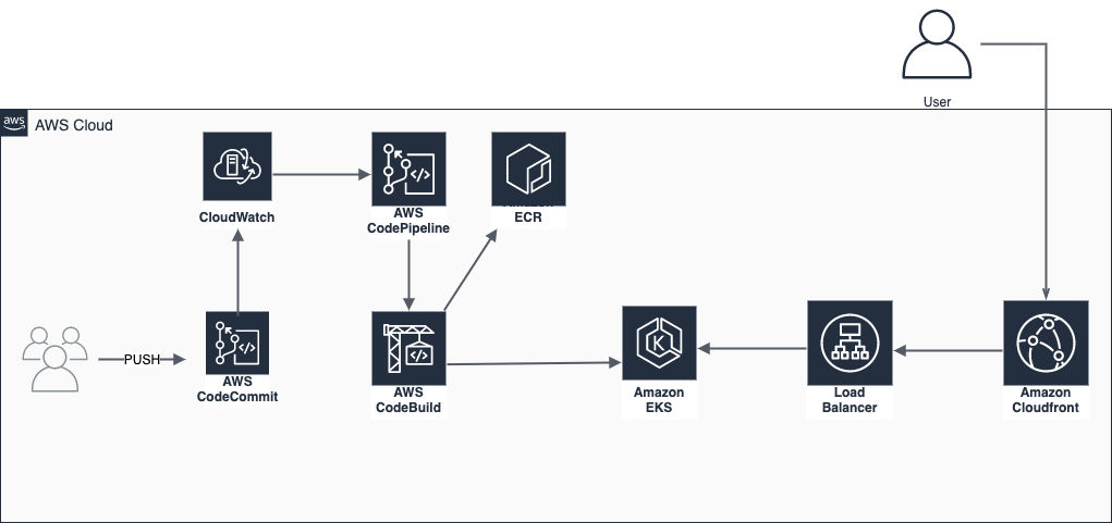 Após a implantação dos principais serviços utilizando arquitetura serverless, iniciou-se um trabalho de migração dos serviços e aplicações para o serviço Amazon Elastic Kubernetes Services (EKS). Além disso, foram criadas pipelines de CI/CD para garantir a integridade dos processos de build, integração e deploy. A figura abaixo apresenta a arquitetura para gestão e execução das aplicações e serviços em containers, sendo executada no serviço de container gerenciado que permite executar e escalar aplicações do Kubernetes – o Amazon EKS.